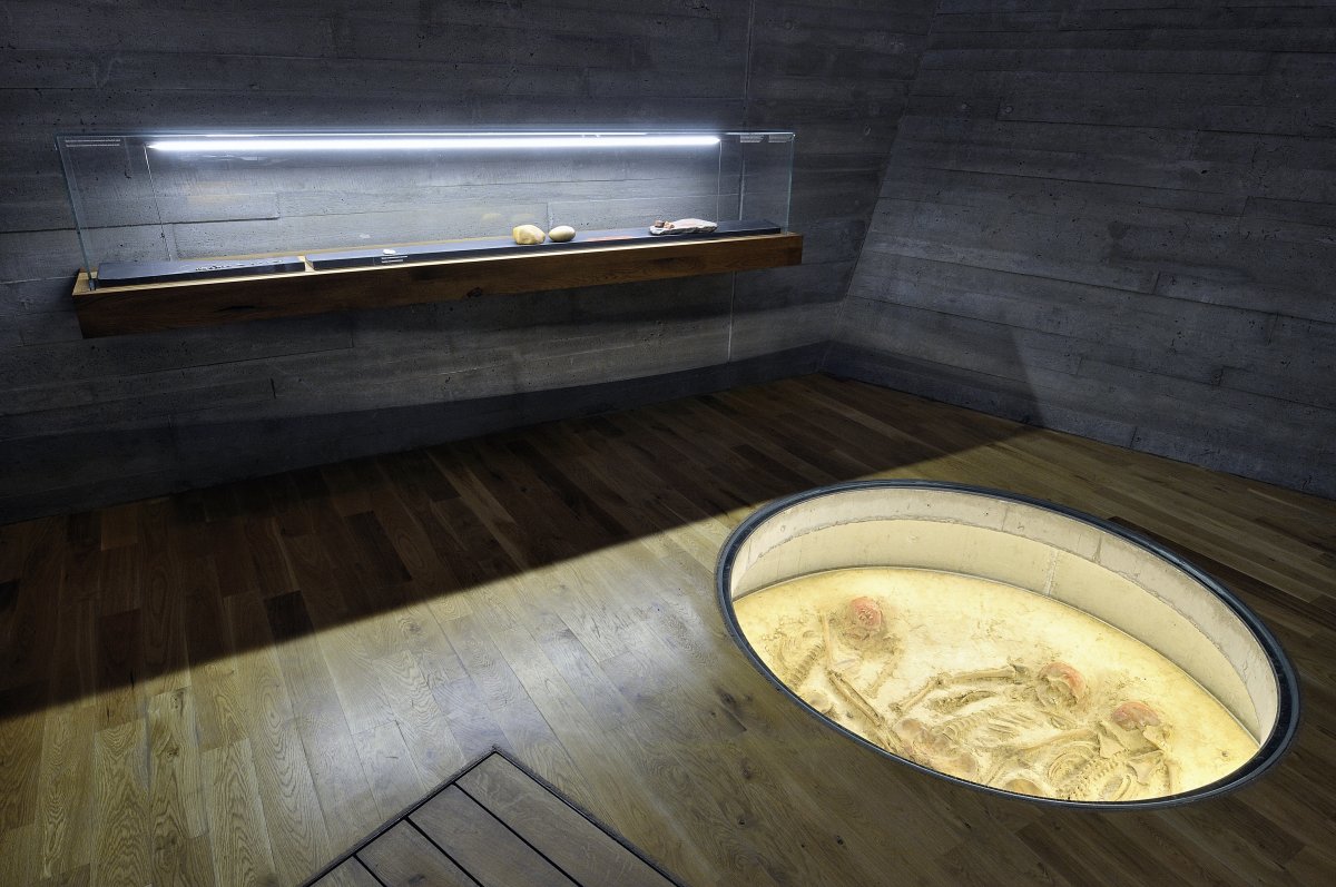 For many decades now, excavations at the complex of Palaeolithic (the period of mammoth hunters) settlements have unearthed a huge number of stone and bone tools and artworks, as well as the skeletal remains of anatomically modern humans. This puts Pavlov and Dolní Věstonice high on the list of the world’s leading archaeological sites. The site reminds us of a past historic age. It is both part of the universal cultural heritage and a symbolic, integral element of the local culture, fundamentally shaping the relationship between the local population and the region. It embodies cultural values that the local population takes pride in and establishes their relation to the country. The outstanding and attractive architecture and the exhibition cover an area of more than 500 m² and combine contemporary audiovisual technology with traditional museum displays. They allow the public to become acquainted with the most important discoveries that scientific research has uncovered in the area. In addition to photographs and documents that detail the history of the various excavations on these sites, the museum also displays the actual finds and explains the spiritual world of the local ancient people. Special emphasis is placed on topics such as hunting, the everyday life of hunters, their art, burial rituals and other aspects of their world. Archeopark has a delicate location in the sense of its broader urbanistic setting. It is located on the border of a village and the open countryside and forms part of the Pálava Hills’ impressive scenery. The majority of the construction is situated underground with just the white concrete towers projecting above the ground. The architectonic solution is based on the location’s conditions and was formulated according to three principal aspects: 1. The construction site is part of a national cultural monument, limiting construction to the archaeologically already excavated and researched area, with the only exception being the “in situ” exposition. 2. It had been assumed that the archaeological excavations are located 4–5 metres under the current terrain. 3. The construction site is part of a protected landscape area (PLA). Based on these aspects, the concept of an underground construction arose together with the loose paraphrase of “limestone rocks standing out from green meadows and vineyards”. The main exhibition area—as well as the administrative, technical and social areas—is hidden in the hillside. The skylight tower projects to the exterior, as does the conical entrance and the look-outs to Děvičky and the lake below. The intention for the building was to be reminiscent of the shape of a cave. Regarding the materials, up-to-date means were used to express monolithic reliefs with concrete, oakwood and glass. The entrance area of Archeopark is defined by gabion walls and forms. This is a multifunctional zone, which can also be used for open-air activities, such as theatre performances, or as a further background for archaeological work. This open-air landscape project accommodates the spatial and functional use of the area while subtly contributing to the scenery under the Děvín hill.