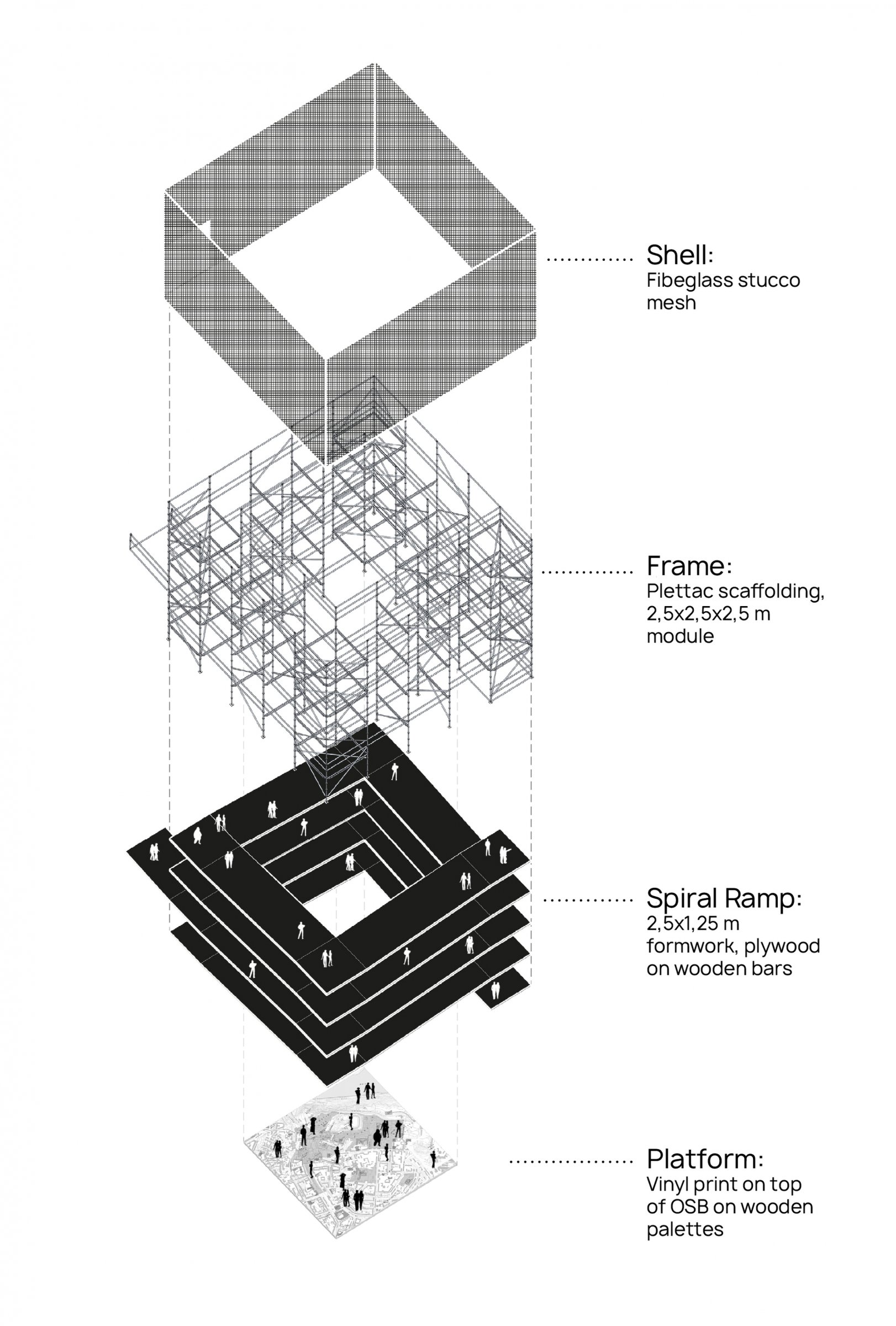 The pavilion for the Revolution of Dignity Museum is a short span project to galvanize transformation of a surrounded landscape. Since 2018, when two best projects for the Museum Building and the Memorial for the Heavenly Hundred Heroes were selected through competitions, nothing has happened. While the collective memory of recent events is still waiting for the comprehensive spaces, people go to the site every day for remembering and gathering. Moreover, the State Intuition, Museum of Dignity requires the space for events and activities. The best idea is to do the transformation right on the construction site of the future Museum, 150 meters far from Independence Square. The site on which the National Museum of the Revolution of Dignity will be built has a long and complex history. To some extent, its condition reflects our society today - a ruptured pit with numerous incomplete foundations from previous attempts to create something new. The designers believe that temporary intervention is a relevant instrument to shorten lengthy expectations and to shed a light on the process behind architectural solutions. The triggering moment for the pavilion was the Revolution’s 5th anniversary on November 21, 2019. The architects had been invited to the project one and a half months prior to this date. Finding themselves in this complex timeframe and political context, they realized that it iswas a great time to challenge the National Institution for the architectural experiment. What could be more temporary than scaffolding? A design that is never intended to last forever is perhaps the best tool for temporary transformation and allows for maximum flexibility. The cubic shape is the most universal form possible - the ultimate box. It may be alien to the environment, but at the same time it is the most contextual. Without it, the site is just a shapeless construction pit; with it - a landscape. A spiral gallery inside the cube arises around the atrium. The atrium features a square stage which occasionally becomes an event space, an auditorium, or a community space. This skeletal, multi-level structure is an allegory of the "Yolka" (Christmas tree) on which people climbed during the Revolution of Dignity to see events around. Later, protesters covered it with banners, posters, and slogans for political expression. The new space is a continuation of this revolutionary practice.