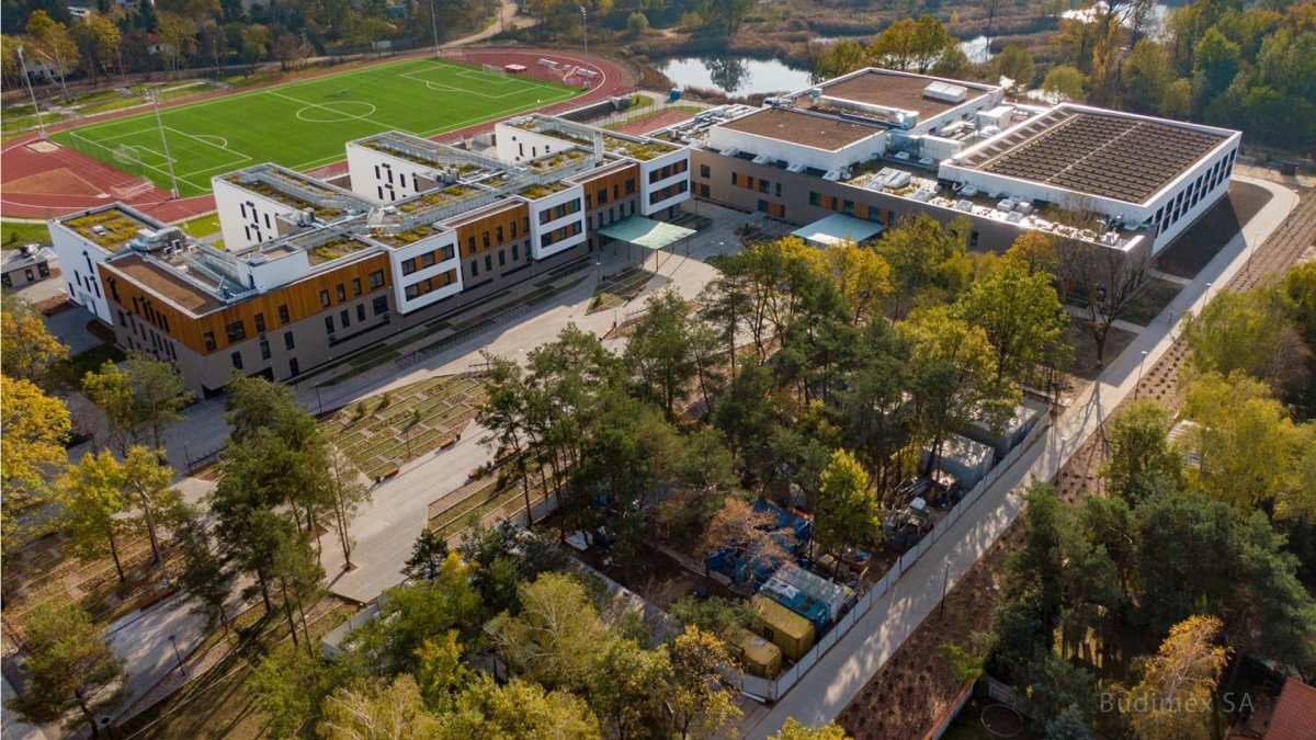The Educational and Recreation Center in Marki (MCER) includes a primary school building, a multifunctional sports’ and theatre building as well as further outdoor sports facilities: 3 basketball courts, a football and athletic field and a mini traffic town. The primary school building with a student cafeteria and a public library has the capacity to accommodate 1200 students. Each classroom has an individual HVAC system through which lights or window blinds can be controlled by the Building Management System or by teachers manually, via a mobile app. To achieve better air quality, each classroom is monitored for high CO2 levels. The roof of the school building was designed as a multifunctional swamp roof. The water level is maintained at 35 cm during most of the year, which is favorable for the growth of aquatic plants. Evaporation has a positive effect on the microclimate of the area and cools down the building during the hot season. Excess collected water may be used for irrigating the lawns. The second building has a multifunctional sports and entertainment function. The facility houses a 25 metre swimming pool, a small play pool with a 60 metre water slide, a sports hall with 3 basketball courts and a theatre with 300 seats. Furthermore, inside the building there are rooms for martial arts, fitness, a climbing wall and a spa. As a pioneering solution, the major part of electricity is produced by a gas-based heat and power plant which uses the burning temperature of gas for domestic hot water supply by heat exchangers. In addition, 300 photovoltaic cells with a total capacity of ca. 67 kWp were located on the roof of the sports hall. Thanks to the different working hours of the facilities, energy can be distributed in the most efficient way. To achieve green status (BREEAM), time switch lighting controls, water-efficient plumbing fixtures, car-sharing lots and electric car charging stations were established. Moreover, high-quality ecological materials were used for the construction, such as low VOC paints, recycled flooring and acoustic ceilings.