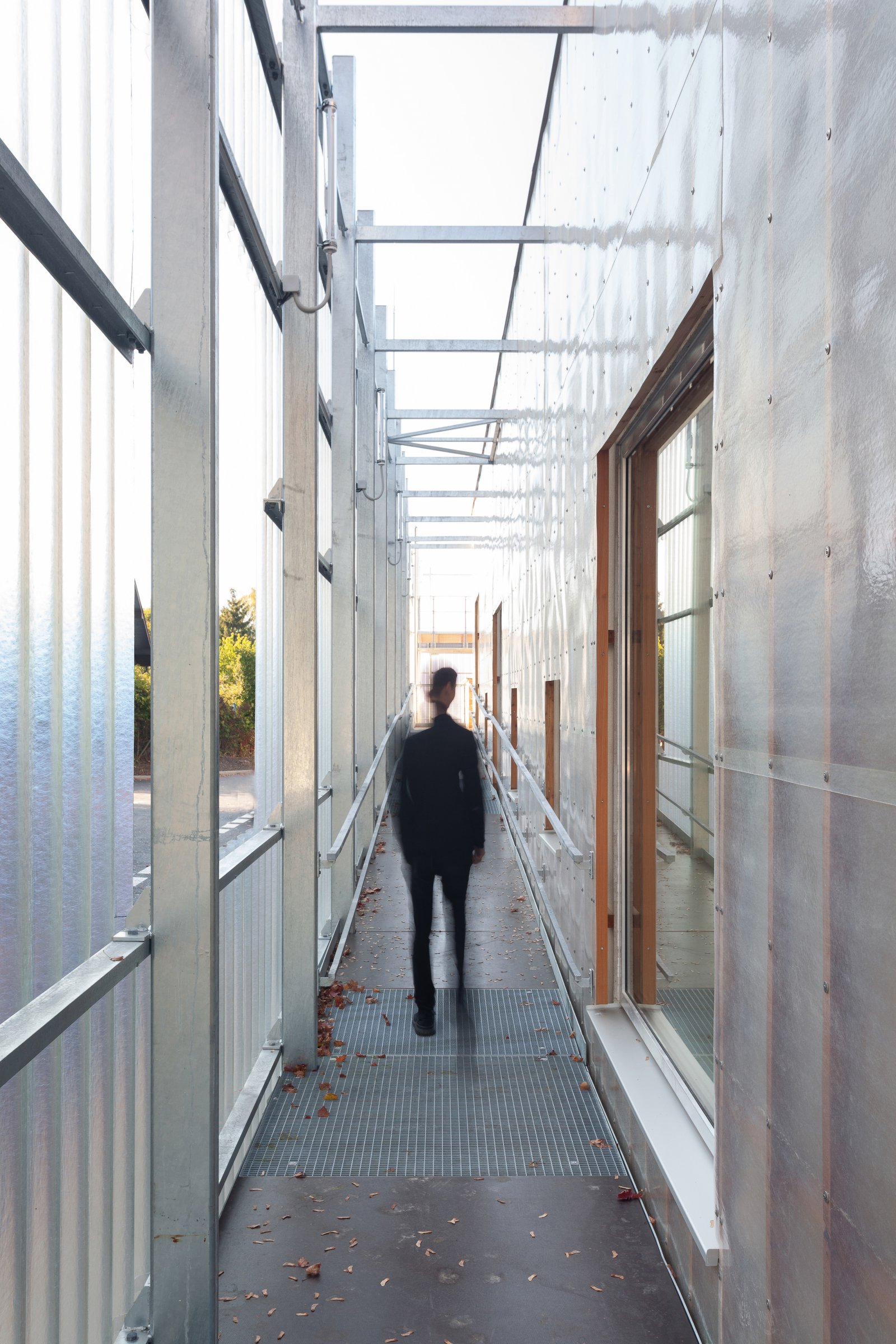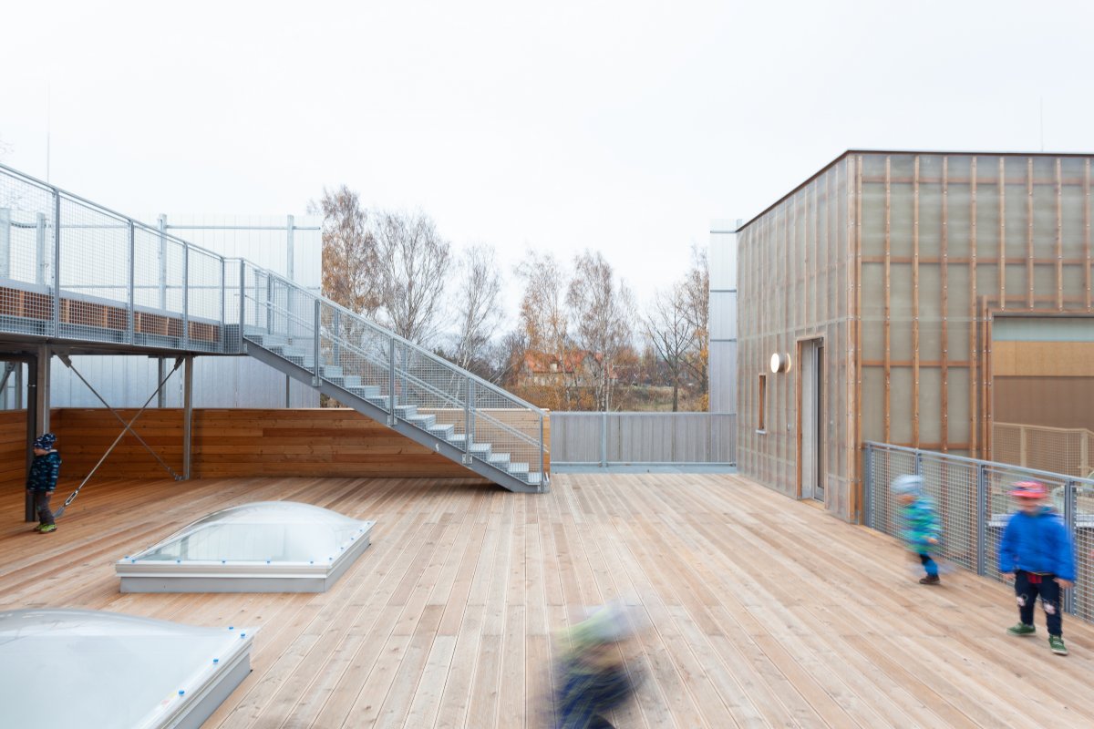The new Kindergarten Nová Ruda answers the need of a city district related to its growing population. The plot is the property of the city and was chosen as most suitable for the new kindergarten and the new housing development planned in its immediate vicinity. The quality of the chosen plot was not entirely appropriate as it is a north-facing slope, shaded by a highschool building and crossed by several infrastructural routes. All these restrictions, as well as the new requirements regarding the quality of the environment in which children are to be educated, crystallized in the submitted proposal. The solution offers children the possibility of endless discovery. Children can learn about the various architectural configurations present in the building while modifying and adapting the spaces as they see fit. Their classroom is not an ordinary rectangular space, but one that is visually connected to the exterior by large parallel windows. Children's activities vary throughout the height of the building: the lower part contains a sleeping section, while the floor above houses the playroom. The top floor with the largest clear height serves as a classroom. The skylights bring natural light into these areas as well as the dining room on the ground floor. The building is sized for two departments of 25 children, an office for 4 educators, and another office for the nursery manager and the gardener. The kindergarten is designed as a brick building with a glass-fibre façade on a wooden grid. The whole building is embraced by a steel structure with another layer of trapezoidal fibreglass. This concept of transparency enhances the whole mass and creates a sense of security. The outer façade of the house forms a soft veil that embraces the whole inner world of the kindergarten. The outer shell blends the two slim volumes of the two compartments which are connected at the back by common spaces and functional areas. Thus, this connection turns the inner atrium into a sheltered and pleasant space.