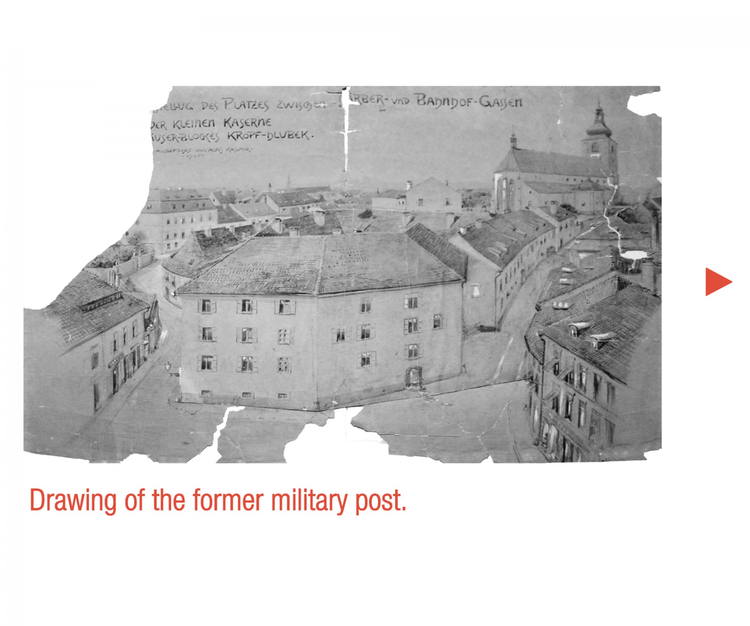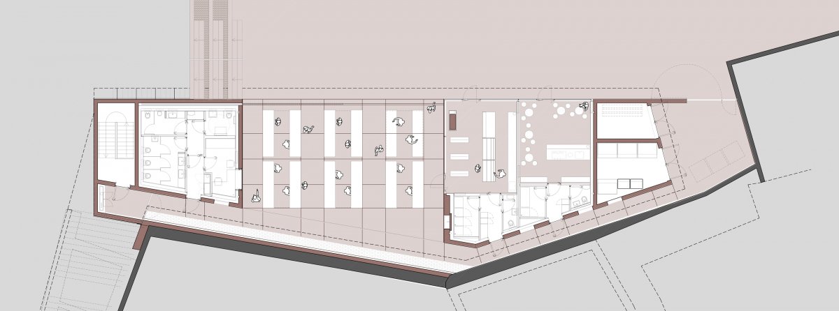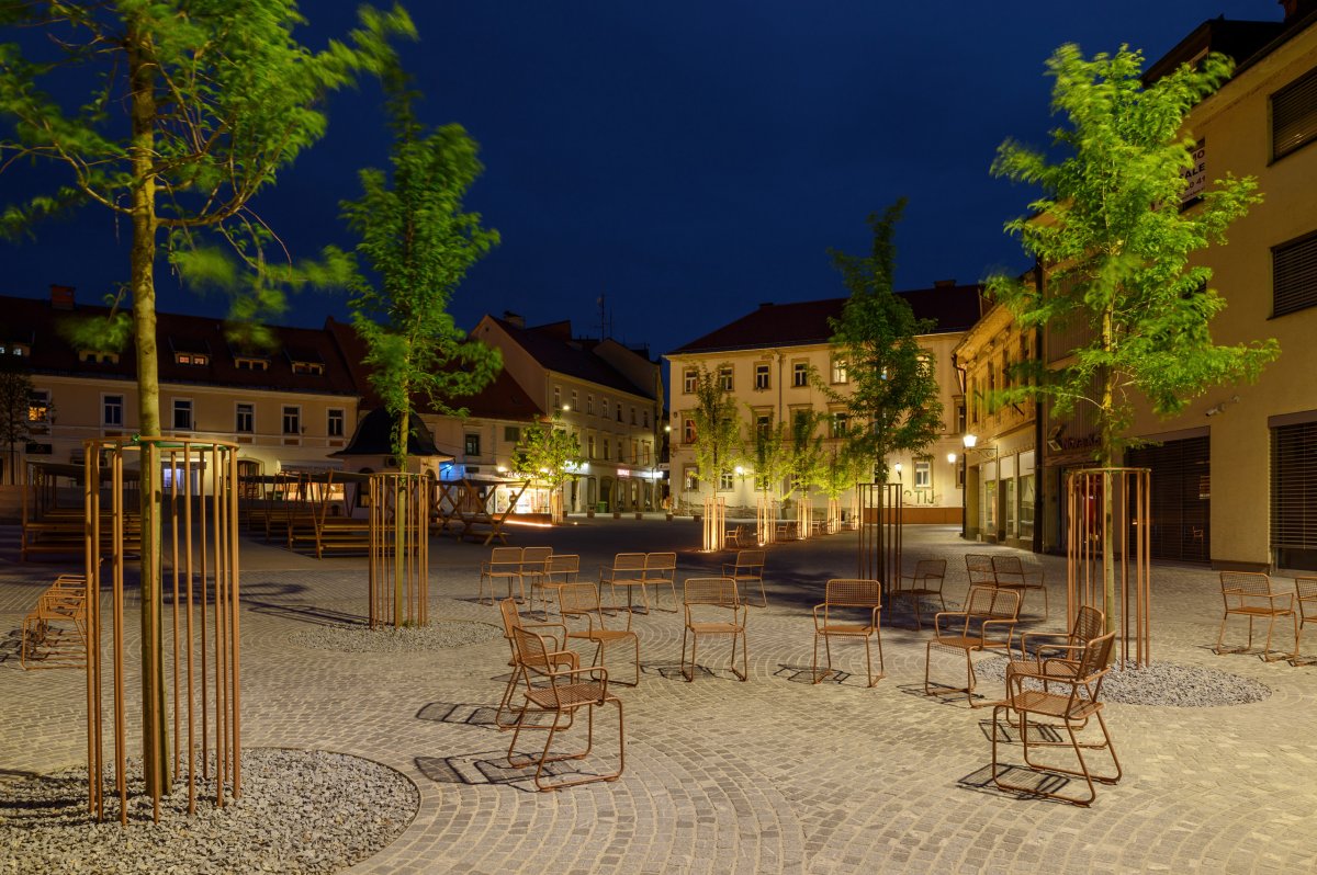 Although the open space behind the church of sv. Jurij seems to be self-evident these days, it was never intended to be a city square. The space used to home military barracks, the brick roof of which contributed to the recognisable image of Ptuj as a city of red roofs. The marketplace is paved with reddish terrazzo following the form of the former barracks, returning Ptuj what the destruction of the barracks took away. Two local materials were used to pave the square, the Drava River gravel paving and the Pohorje Tonalite. The marketplace structure is made of red concrete and features distinctly horizontal geometry. The horizontal roof underscores the verticality of the church bell tower and so gives even more prominence to this city landmark. Specific elements of the marketplace are bespoke chairs positioned in a way that creates various ambient compositions. Some groups of chairs are linear, others are round, they are placed under trees and some singular chairs are found throughout the marketplace.