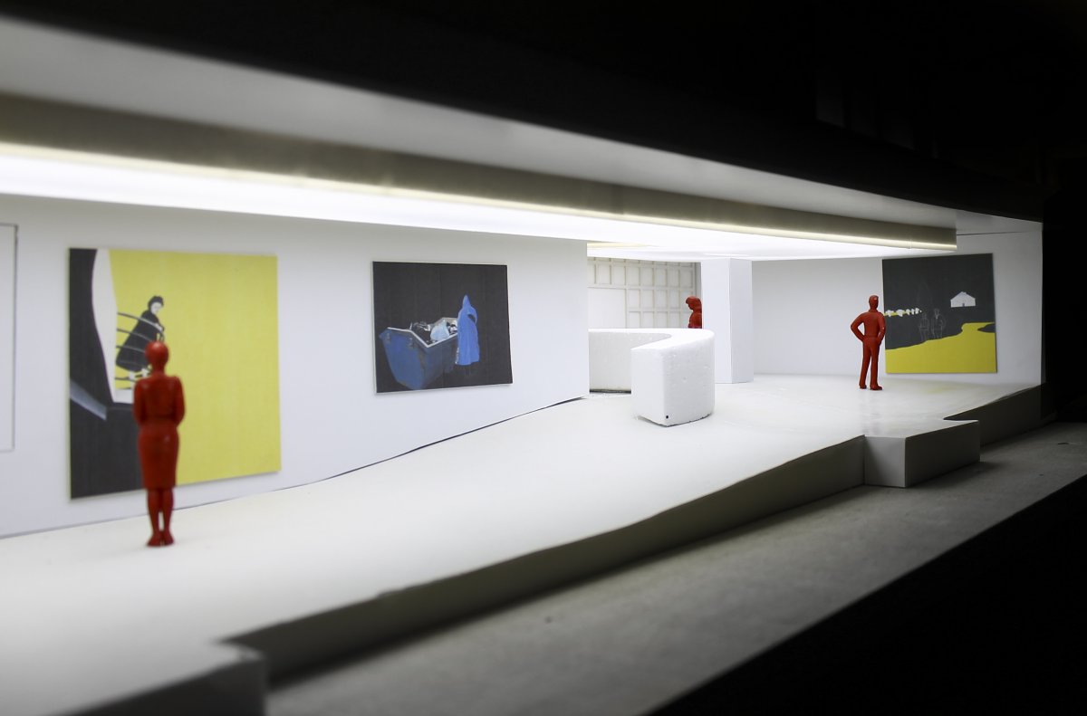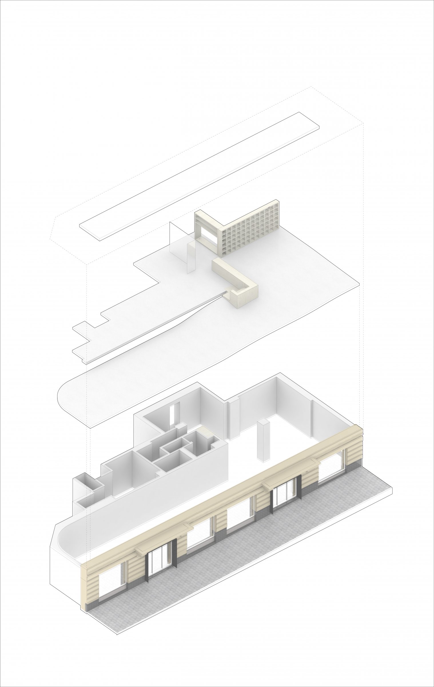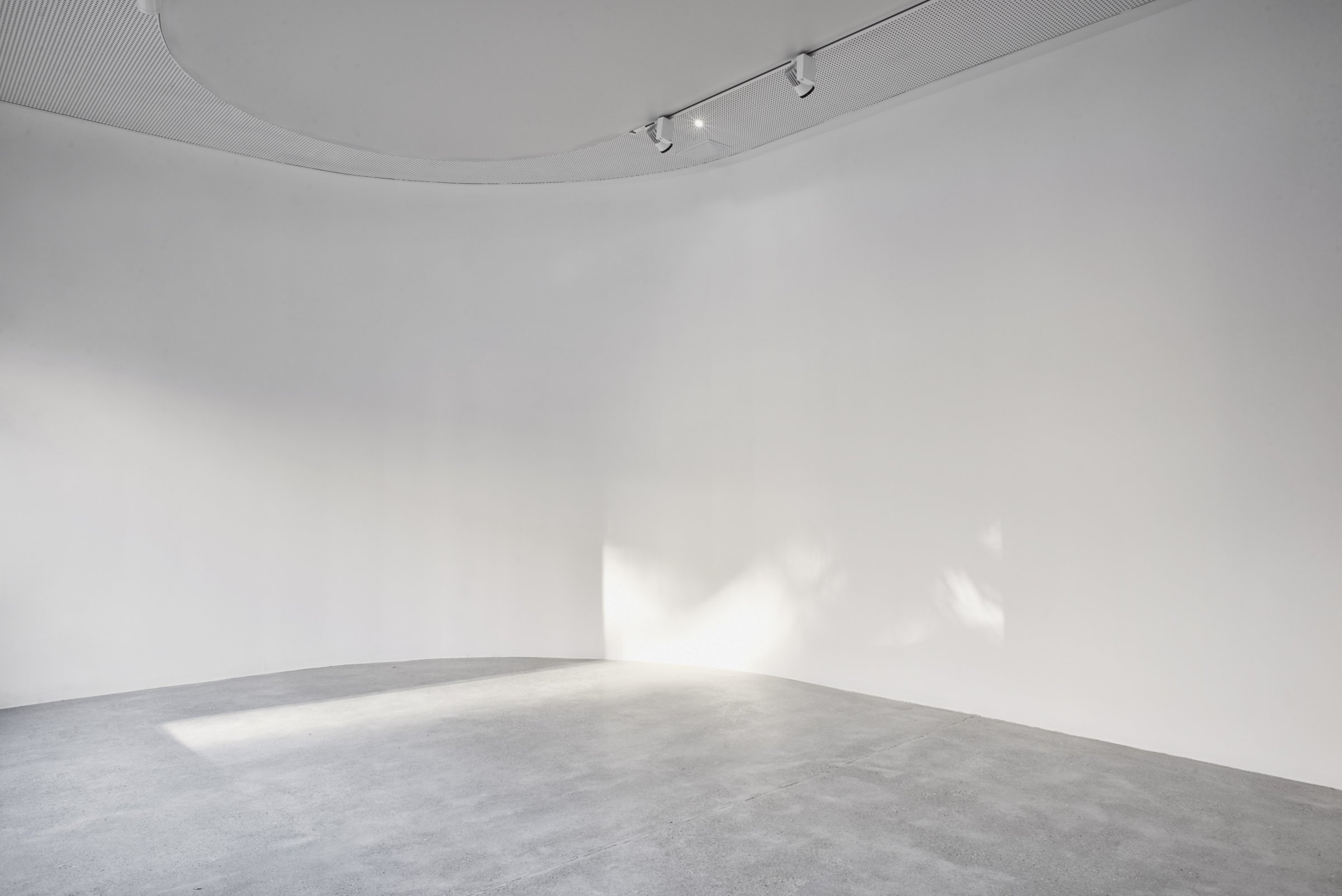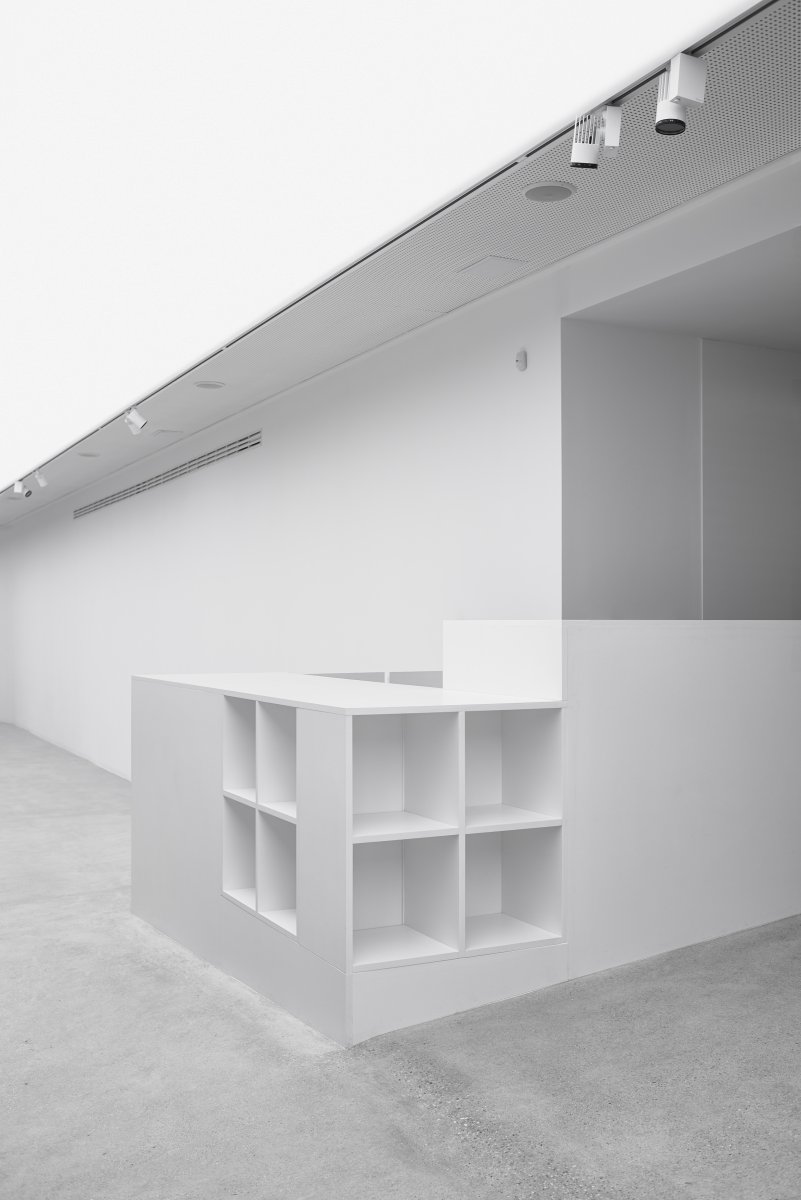 The white cube’s encounter with the slope. Planning the white cube exhibition space with respect of the terrain conditions. A responsive white cube. This is the easiest way to describe the Hegyvidék Gallery opened on the slopes of the Buda Hills. The exhibition space provides a neutral medium to the reception of artworks, however, it is not only a simple exhibition space. It both shapes the place of connoisseurship and the relation to it: on the longer side the space follows a downhill and therefore tracks the features of the relief. The level difference usually solved with steps, here in Hegyvidék Gallery it is continuouslymerging into a slightly sloping terrain. This makes the white cube a unique space that is softened by terrain conditions. What is outside is also inside: the simple white walls cut space out and at the same time they are in sync with their immediate environment. This is also true the other way around: passersby and those waiting in traffic can observe the artworks placed inside the gallery. The huge windows act like the walls of an aquarium, allowing for the examination of the apparently floating artwork in the glaring white, hardly definable space from the outside. The interior design elements substitute as furniture, the windowsills hiding the heaters can be used as seats to take a break and look around from a relaxed spot. The contiguous concrete floor evokes the softness of cyclorama used in studio photography and the Barrisol ceiling lights also enhance this soft effect. The community space opens from the highest point of the gallery. It can serve as a separate space for screenings or museum education courses and at the same time reflects the vision of the Client to provide a meeting point, a cultural center for the district.