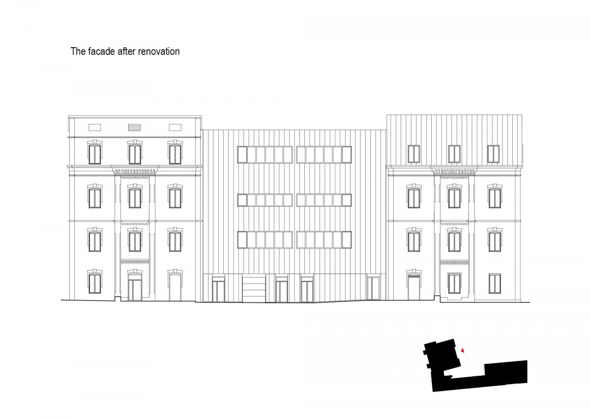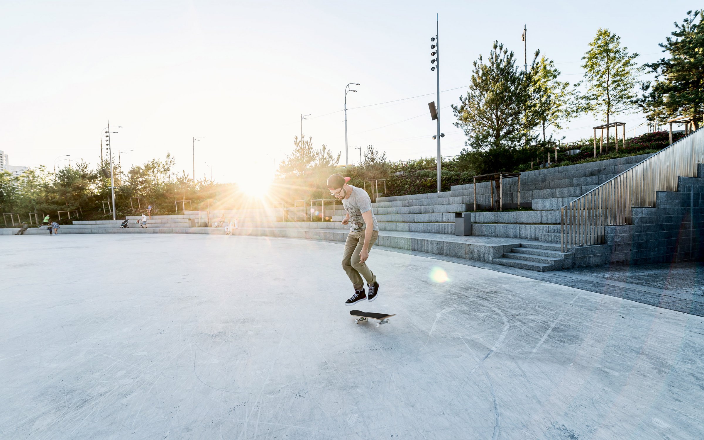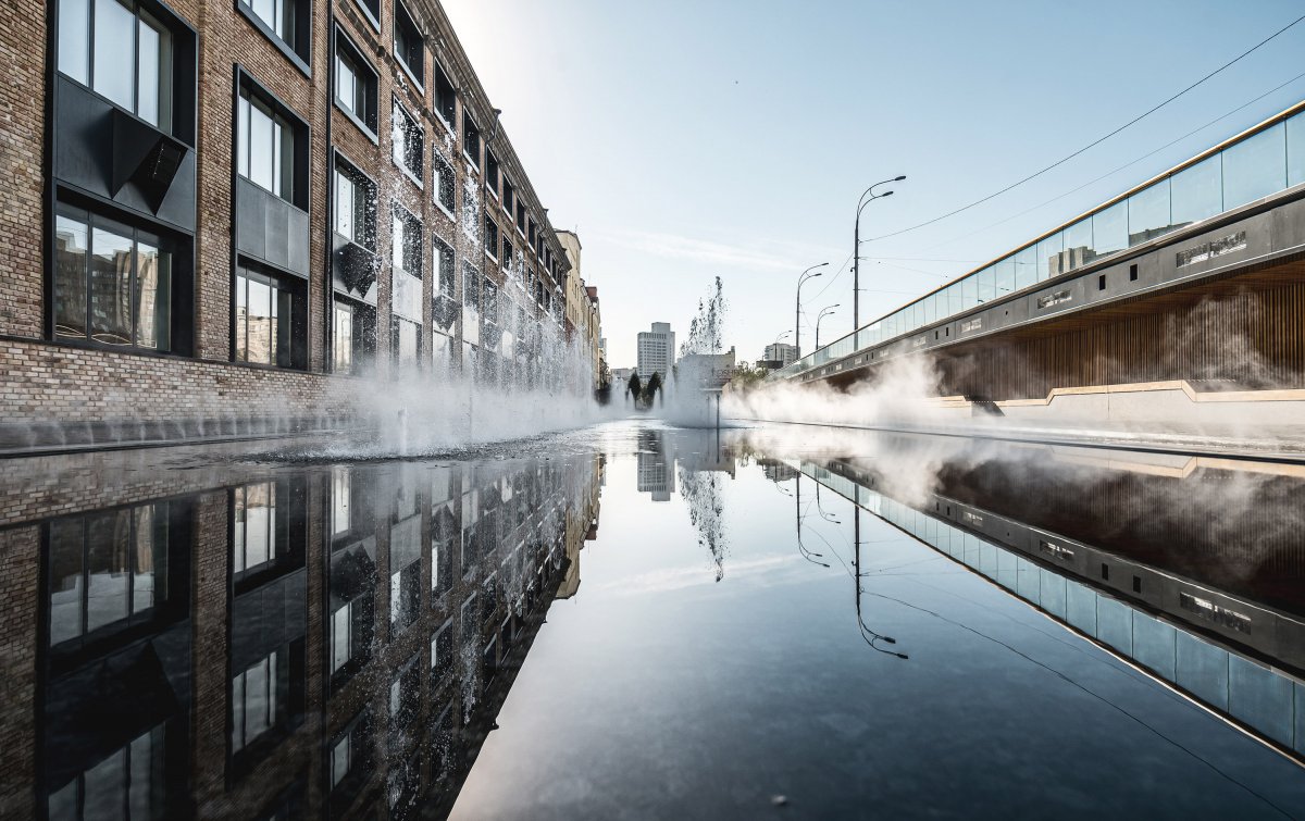 Roshen Plaza is a large revitalization project on the territory of a confectionery factory in Kyiv, including a landscape redesign. To create a new park on the former industrial site, the Roshen confectionery corporation conducted a closed international competition, which was won by the French landscape firm InSitu. The adaptation of the park design, which includes an ice-skating rink and fountain was carried out by the Kyiv architecture firm AER. The facade renovation project was performed by AER. The entire space of the new park was developed along a main path that twists around the ice rink and runs along an embossed brick wall to the fountain in Roshen Square. The ice rink is surrounded by an amphitheater of granite blocks, with trees growing between the rows. The trees act as a barrier against noise and wind while creating a cozy atmosphere around the rink. As conceived by the creators of the garden, the precise lines of the stone elements are in contrast with the deliberately chaotic landscaping. In the center of the park, a former production building has been repurposed. The first floor of the production hall was transformed into a children's recreational center and sweet shop while new offices are located on the upper floors. On the territory adjacent to the park, two green parking lots are being built. A smaller one for office workers, and a larger one for park visitors. In the evening, a video installation by the renowned light and sound artists Les Eclaireurs is projected onto the main façade. Hundreds of spectators come here on summer evenings to watch the show and enjoy the dancing fountains. During winter, the park turns into a Christmas village, with a Christmas tree in the center of the oval ice-skate rink and street food stalls surrounding the rink. The translucent rink fence is dismantled for the summer, and the amphitheater space turns into a park used by skateboarders and cyclists.