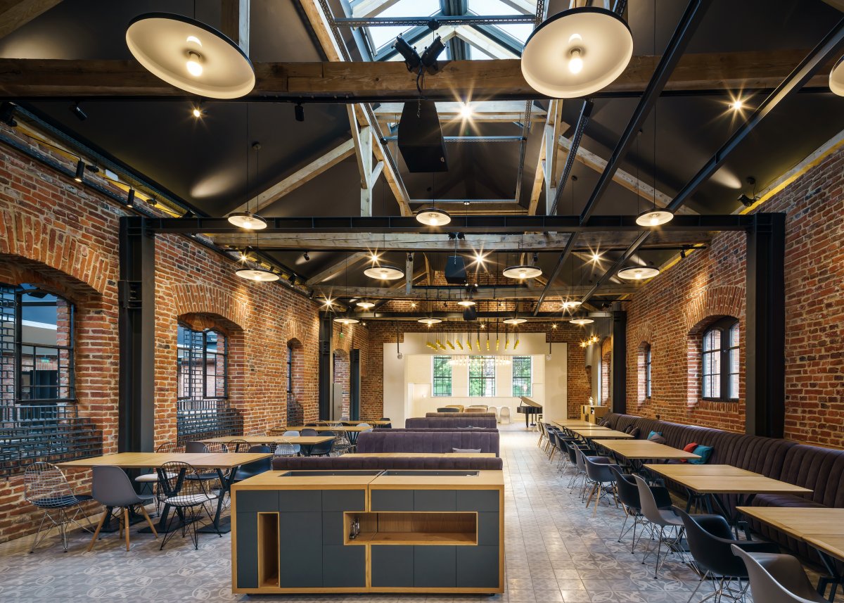 The existing situation: amalgam of properties, old, degraded buildings, newer overlapping buildings, the Hunyad Castle and a city in reconstruction after the decline of the industry that kept it alive. In an industrial city the history of which revolves around iron mining, following massive demolition processes, there is minor industrial heritage stock built today. There are few buildings left to recall the Iron Factories. This project addresses this issue. The existing ensemble taken over consists of two buildings belonging to the old Iron Factories (ca. 1885), parasitic constructions and other unhealthy annexes. The objective was to create a multifunctional ensemble with the main function: a restaurant. After identifying the building phases, the objects, and the original elements, the architects removed the parasitic buildings and rehabilitated the two buildings with historical substance. After the interventions, the buildings returned to their original volume. Inside, the framing geometry and the brick were revealed; the original wooden and steel elements were recovered, rehabilitated, and reintroduced into a new life cycle. The materials used in the interventions and the design are based on wood and steel. The architects sought to create a unitary interior space, relying on a course of contrasts. Thus, between the existing buildings, they proposed a new, coagulant volume. Their (almost obsessive) vision to give a view of the facades, and roofs of the existing buildings from the interior , turned this volume into a kind of covered yard that abounds in natural light. Surrounded with skylights, the proposed insertion tries not to touch visually the existing buildings and to accentuate this sensation of float, it uses a simple, white, detailless ceiling, as an imponderable plate. The architects used reversible structures and authentic material for punctual interventions; they relied on the sincere use of materials, in their raw form, without aesthetic tricks, trying to induce a sense of industrial space in the user - a strict result of objective, technical needs. The ensemble is complemented by a new, linear body that seeks to become a backdrop for the garden and the street, inspired by the details of the old industrial buildings and perpetuating, in a contemporary manner, their spirit. The intent was to insert a new function in a site with history, with the intention of enhancing it and helping it to come back to life.
