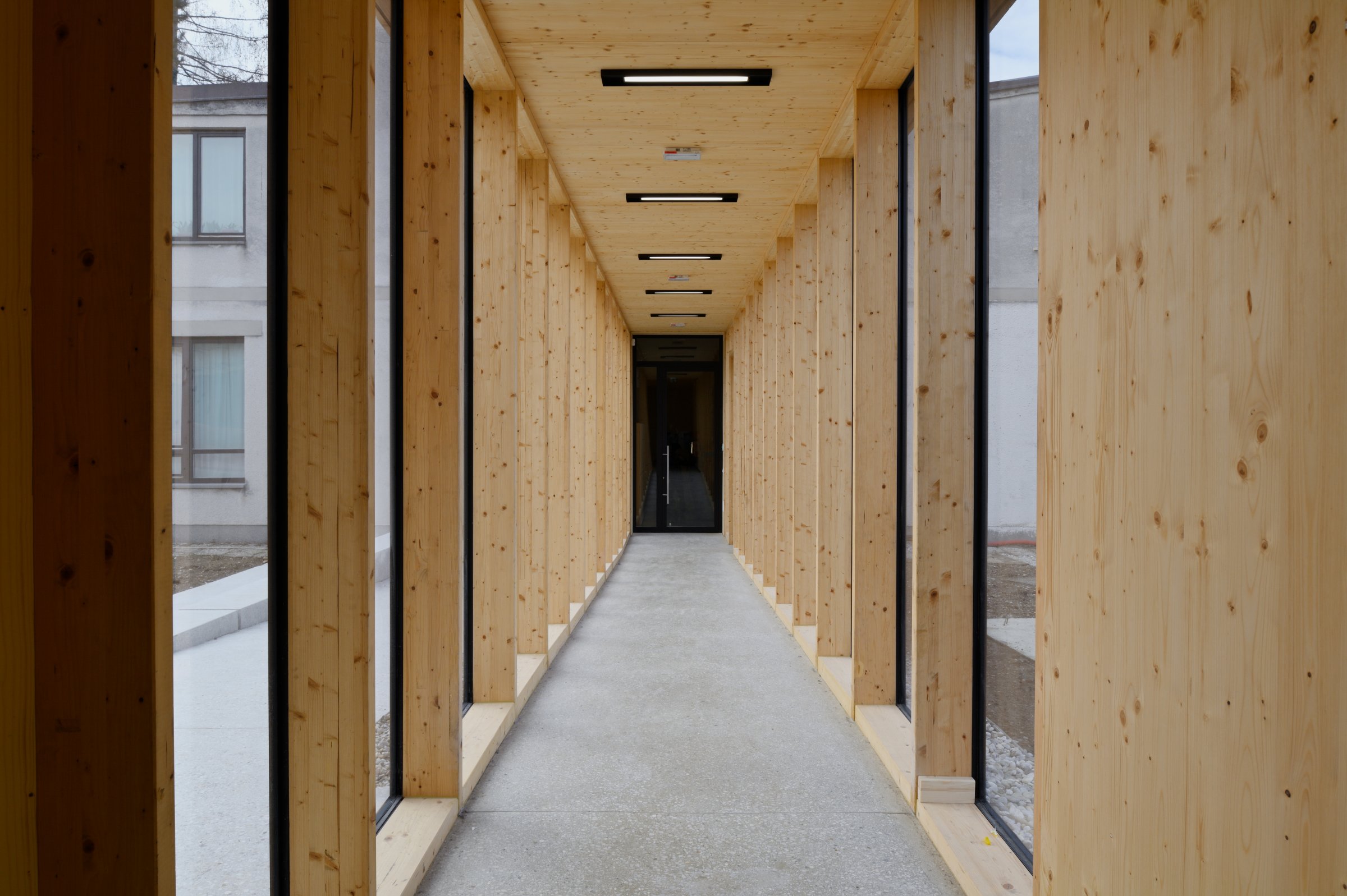 Architecture is more than just an object. Architecture is a dialogue. A dialogue with time, space, and people. The dialogue of the Stražišče gym hall began with architect Danilo Fürst. The buildings of the primary school, designed by Fürst, are representative of pioneering school buildings in Slovenia. The pavilion type school buildings are under protection of the Cultural Heritage Protection Act. The new gym hall is the starting point of a new development program of the area. The design of the building is informed by the search of dialogue with the location, content, scale, and people through time. The gym hall is located at the edge of the cycling stadium and is connected to the existing school with an enclosed hallway. The new pavilion faces the existing green patio at the side of the school and the cycling stadium on the other side. The position of the new gym hall preserves the existing green surfaces. The design of the building is connected to the existing architecture of Danilo Fürst. The rhythm of the facade is closely related to the rhythm of the existing buildings, characterised by prefabrication. The materials are natural; wood dominates the ecological structure. The basement is constructed of concrete, all other elements and surfaces are wooden. The aim of the new gym hall was to create a structure that respects the existing surroundings and creates a new enclosed environment through the use and design of space, light, materials, and time. The new building is an attempt to respectfully contribute to the existing location.