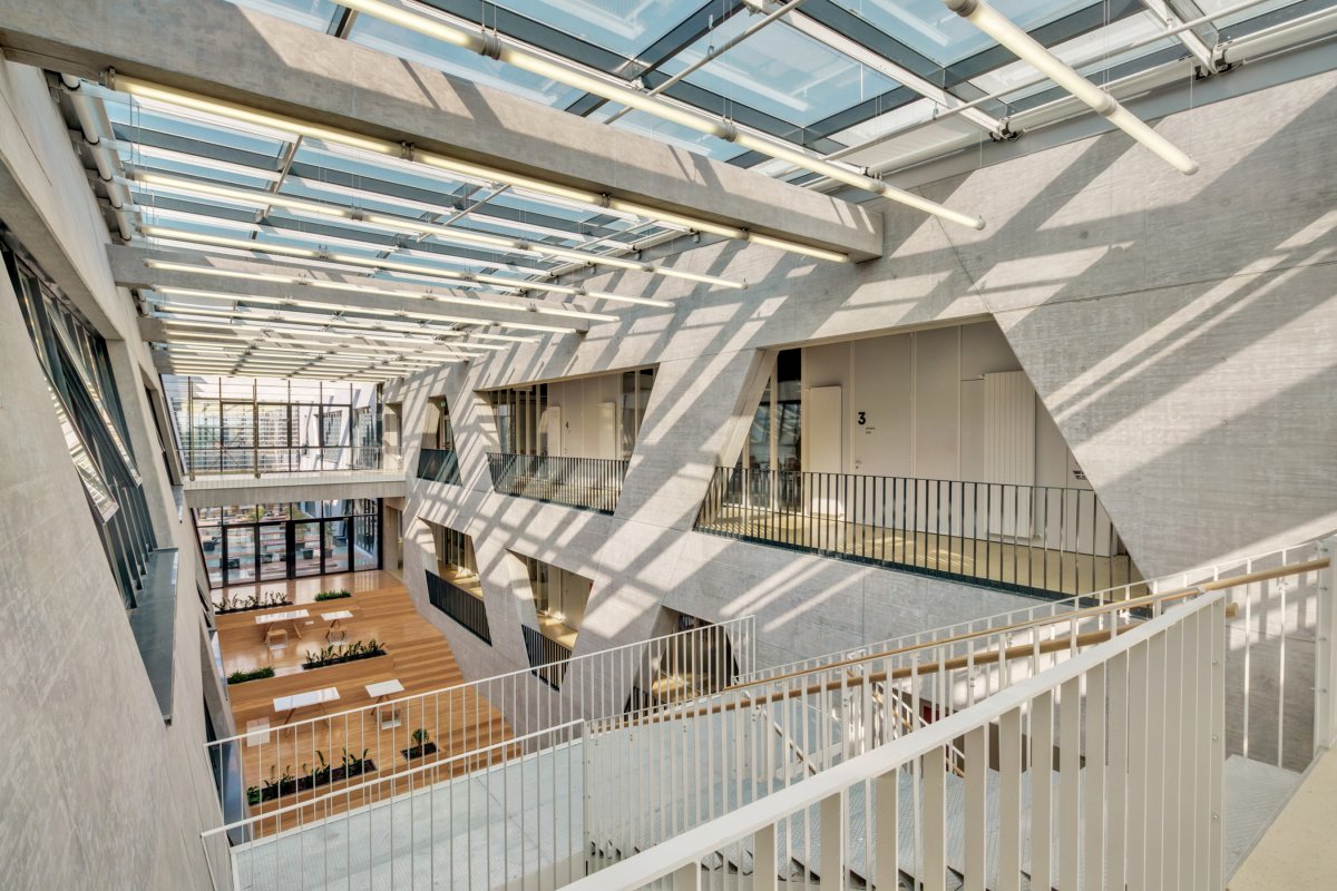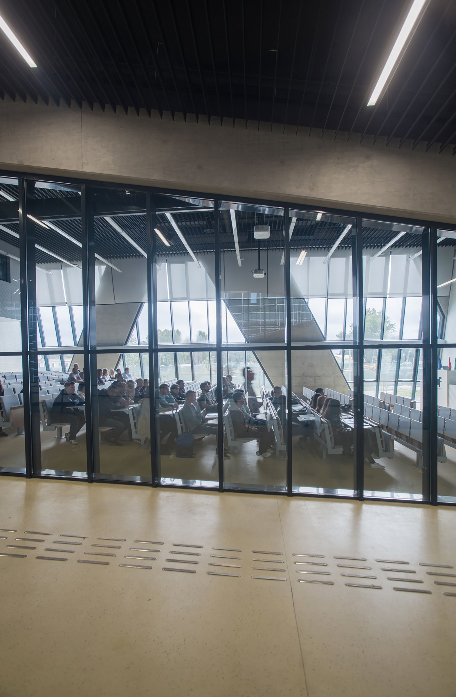 The Faculty of Civil Engineering was built as part of a complex of planned buildings. Its shorter sides are open, while its longer façade creates a narrow and high intermediate space towards the neighbouring buildings. Its cross section is profiled in order to welcome natural light and air. A narrow passage on the western side of the building is expanded by its connection to the hall and portico with larger lounge-areas. By slanting the façade in the East, more light was directed towards the classrooms and lecture rooms. The building has been opened along its entire middle axis by a number of internal terraces and skylights that are places for informal interaction, study and work. Natural light finds its way to the ground floor, and air flows to all the spaces in the middle section of the building. The longitudinal section stresses the importance of communication spaces in contemporary education, designed as places for individual and informal group work, meetings, smaller or larger events. The building is passable from the basement up to the highest floor through wide connecting elements with various additional functions: open classroom, canteen, grandstands next to the Students’ Club, terraces, porticos, a lobby for offices, bike parking, or access to the archaeological site below the building. All corridors have open ends, which emphasize the open character of the building and allow additional light to enter. Bearing constructions consist of five continuous perforated walls made of exposed reinforced concrete. Basic cross profiles of the building were put into focus to emphasize the presence of the long, open corridors.